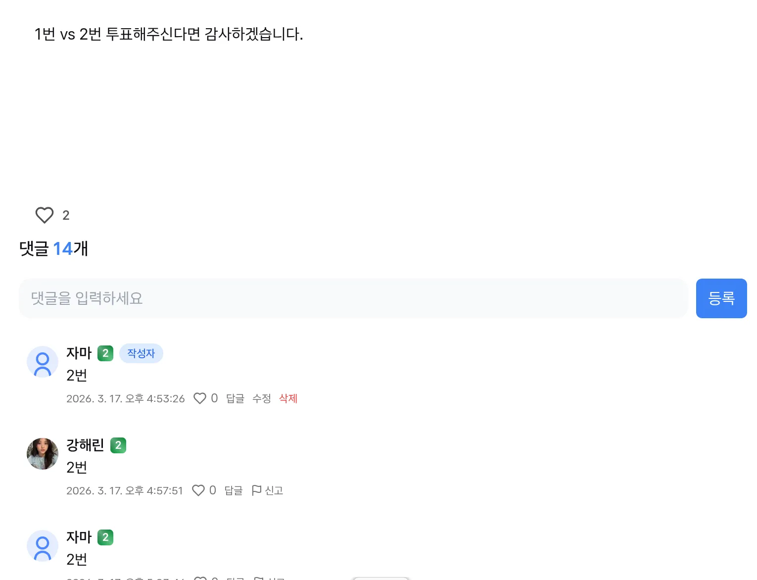 대나무숲압도적이네요자마 22학년2026.03.18 03:4211 vs 1로 박보영님의 압승으로 끝났습니다. 전 개인적으로 당연한 결과라고 생각은 했지만, 그럼에도 불구하고 투표해주신 분들께 감사드립니다.2댓글0개등록