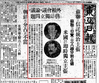 <동아일보가 오보한 신탁통치안> - 사실과는 다르게 소련이 신탁통치를 주장했고, 미국은 즉시 독립을 주장 한다고 적혀있다.