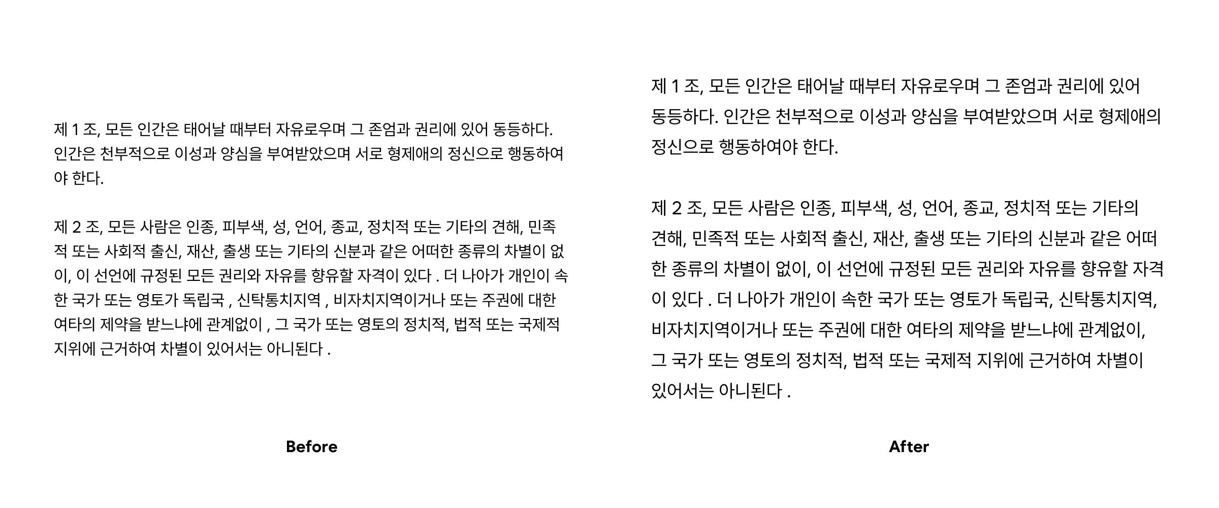 가독성이 떨어졌던 원인인 자간과 줄 높이를 조정하여 읽기 편하게 만들었어요.
