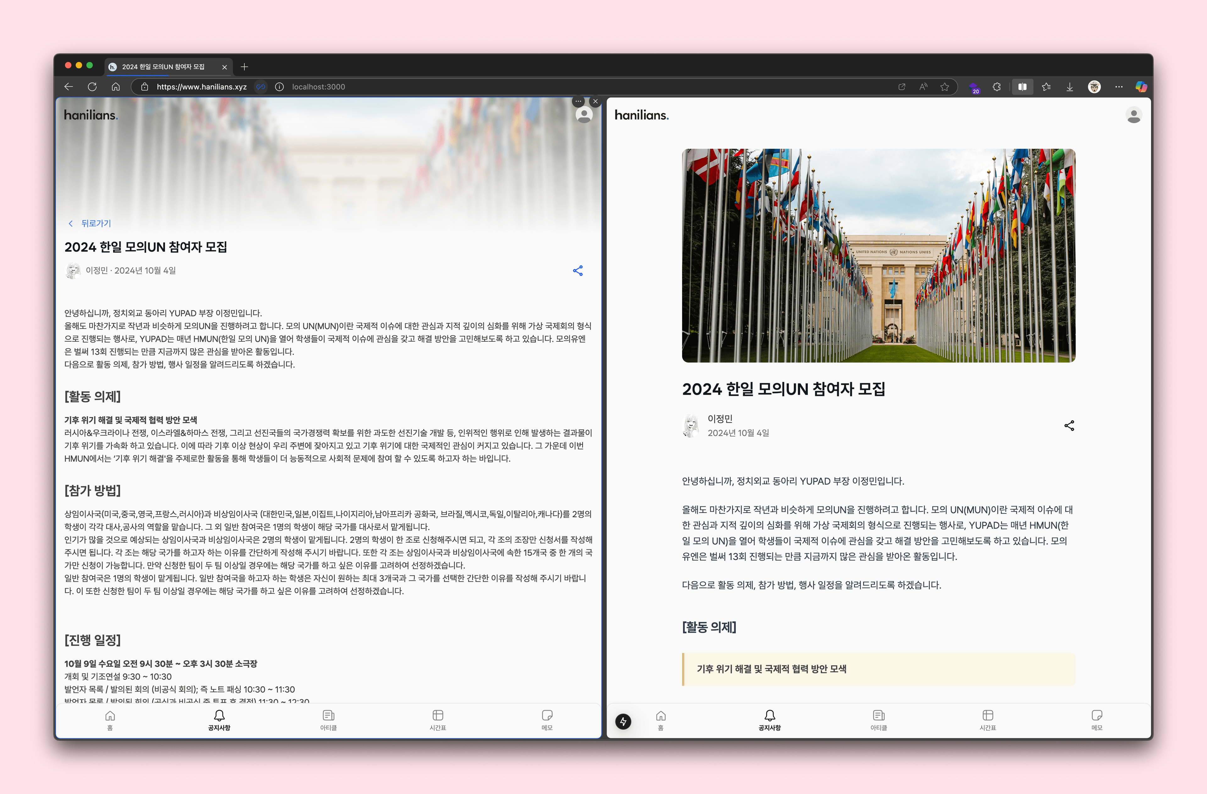 공지사항 페이지와, 학생들이 참여해 글을 작성하는 아티클 페이지는 동일한 PostView를 사용하고 있었는데요, 한일인이 게시글을 읽으려고 할 때 글 가독성이 매우(...) 안 좋았다는 걸 인지하고 다양한 부분에서 가독성과 편의성을 개선했어요. 먼저 Before와 After를 확인해 보실까요?